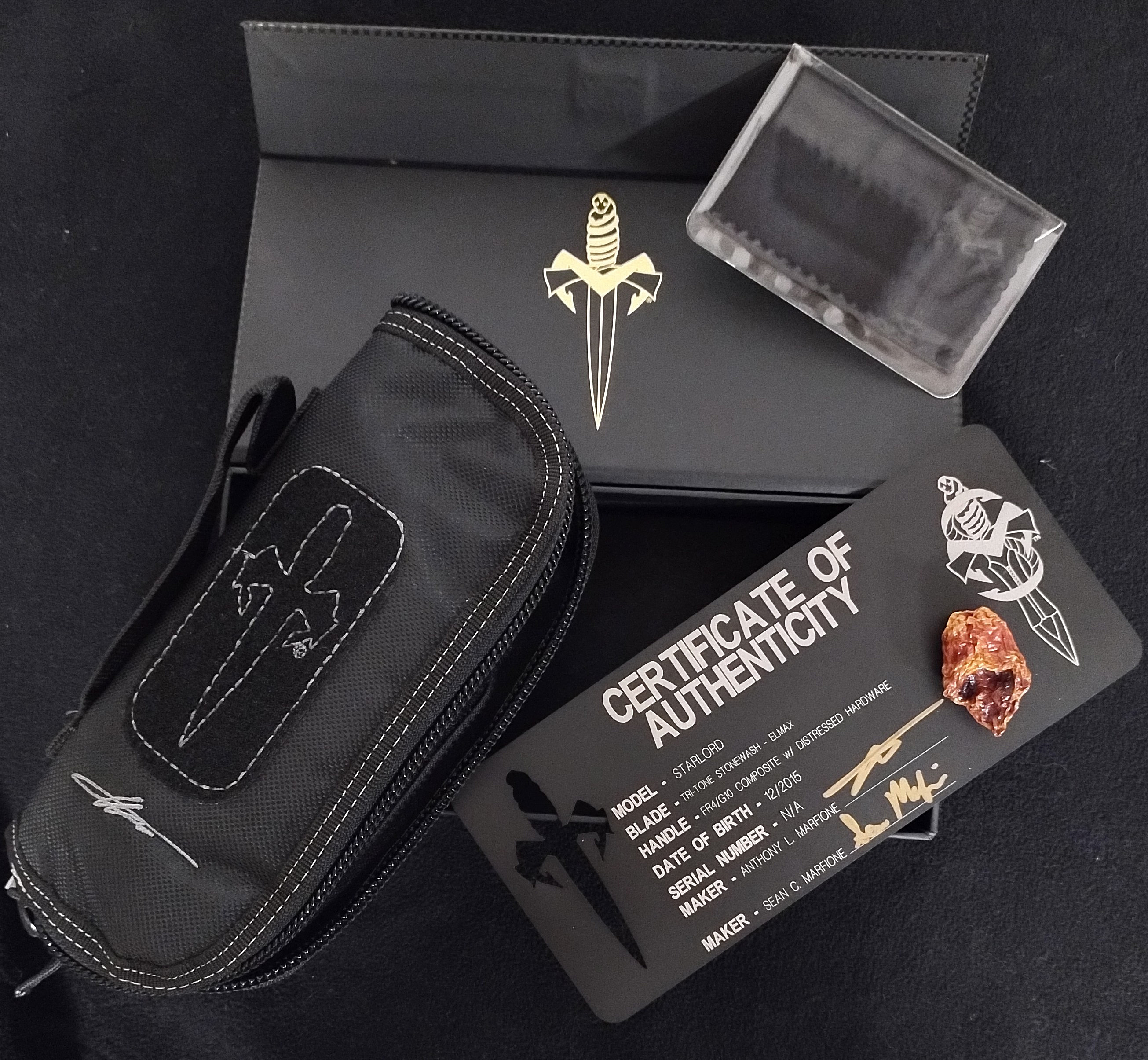 Legendární nůž vyráběný v dílně Anthonyho a Sean Marfionových. Tento model byl vyráběn v malé sérii v roce 2015. nabízený nůž pochází konkrétně z 12/2015. A podle údajů výrobce jich bylo vyrobeno v této kombinaci střenky a čepele pouhých 19 kusů.