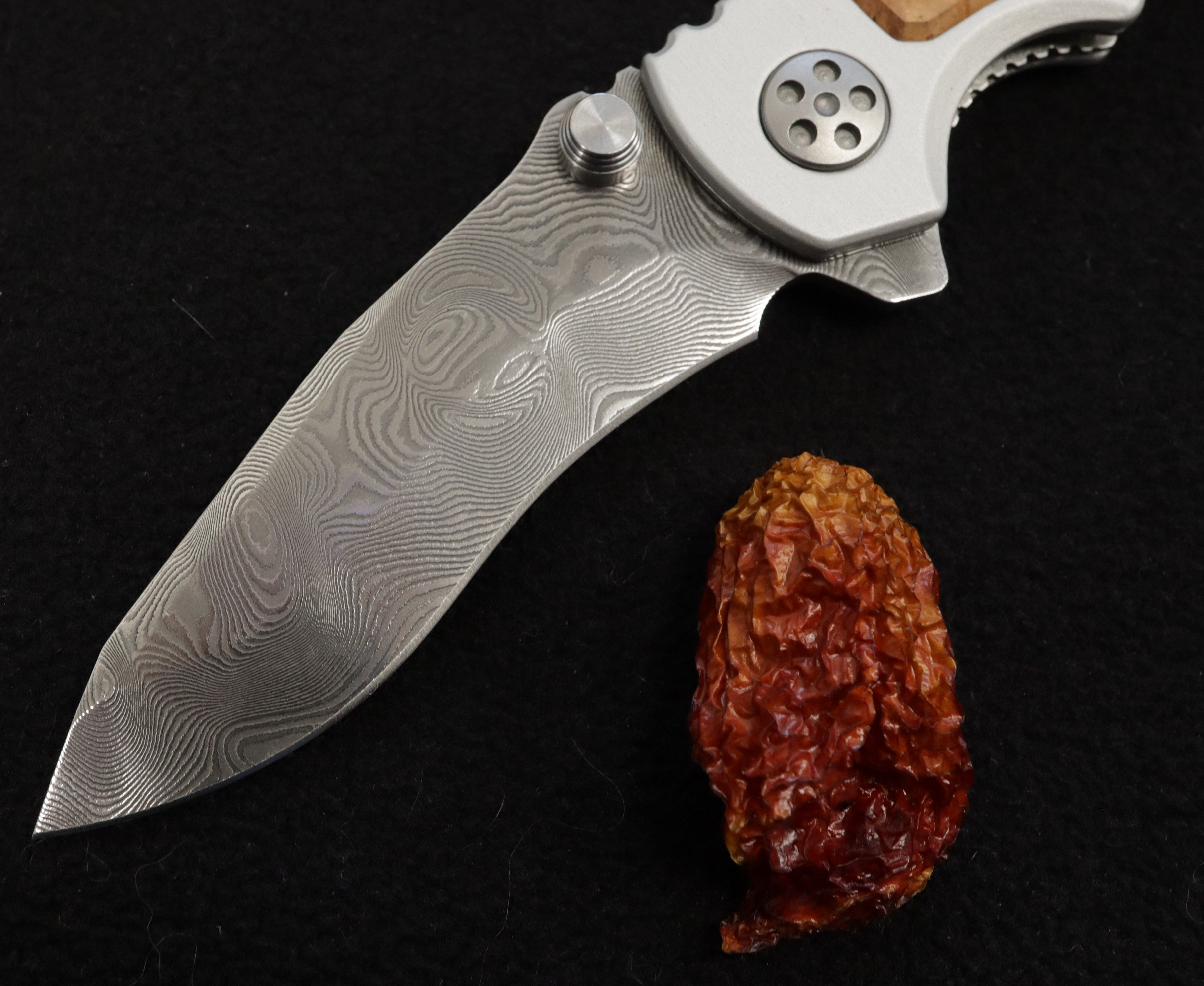 Lehký zavírací nůž s kovanou damaškovou čepelí. Ocel má 160 vrstev a vytvořil jí kovář Markus Balbach.