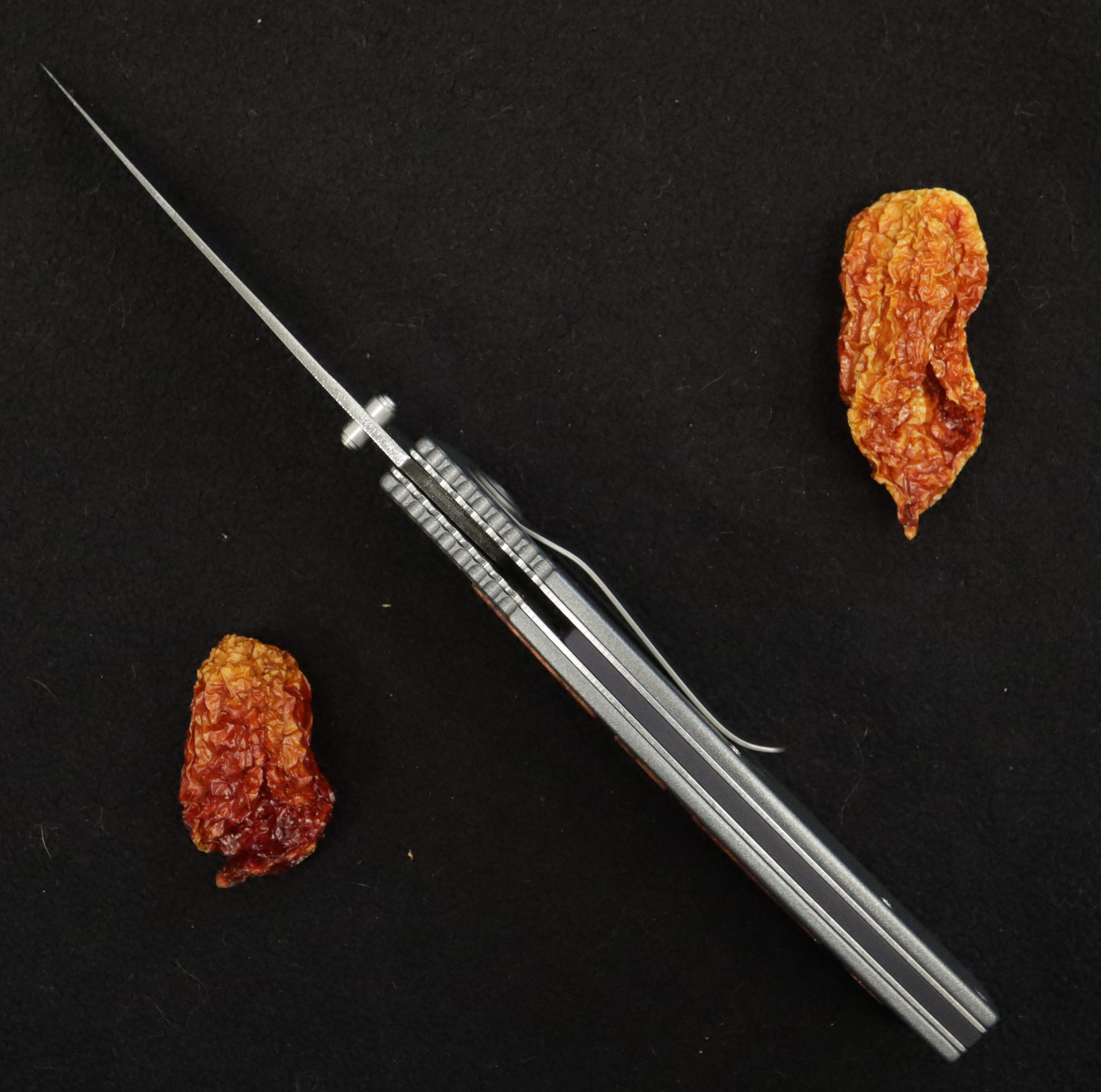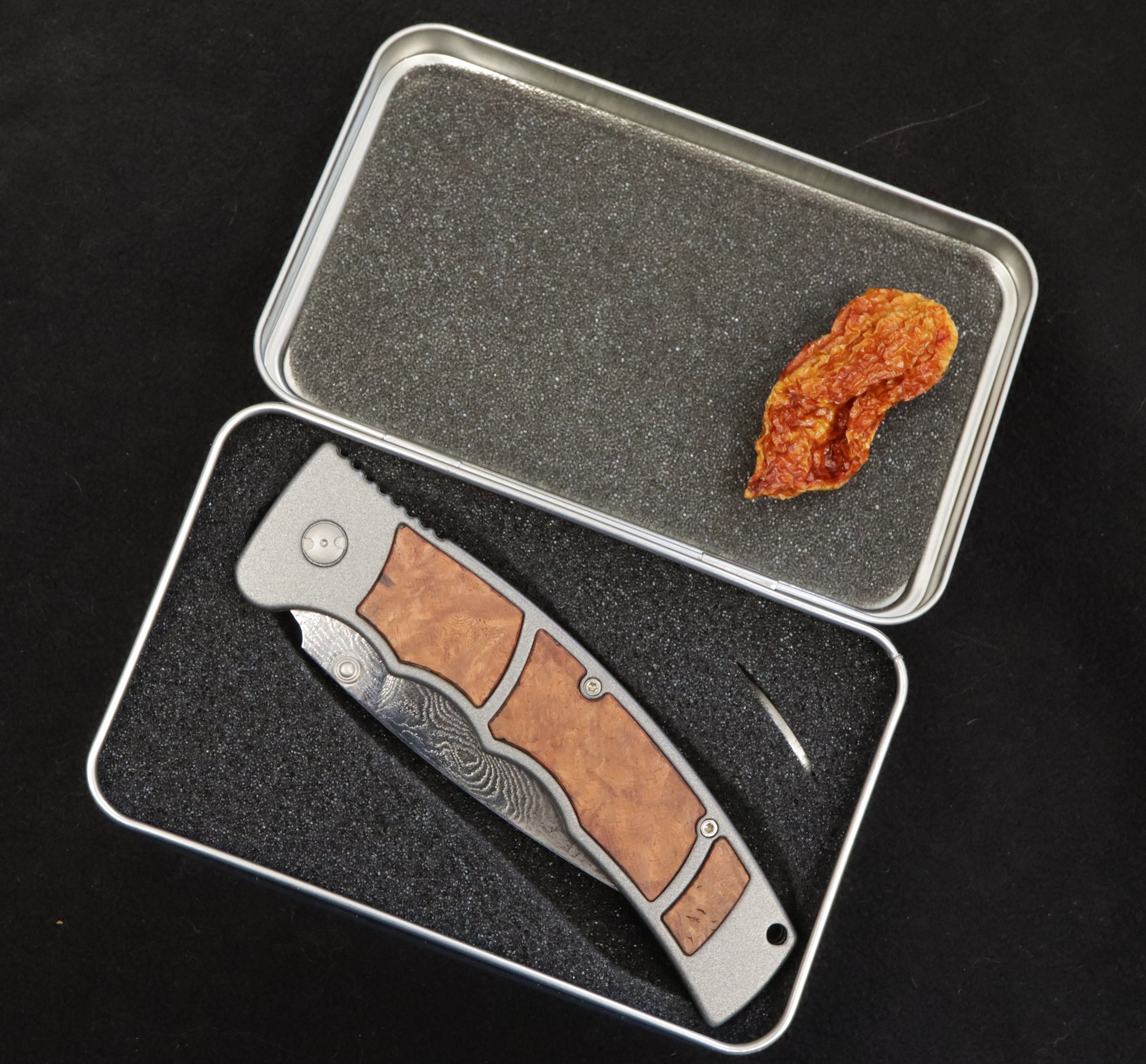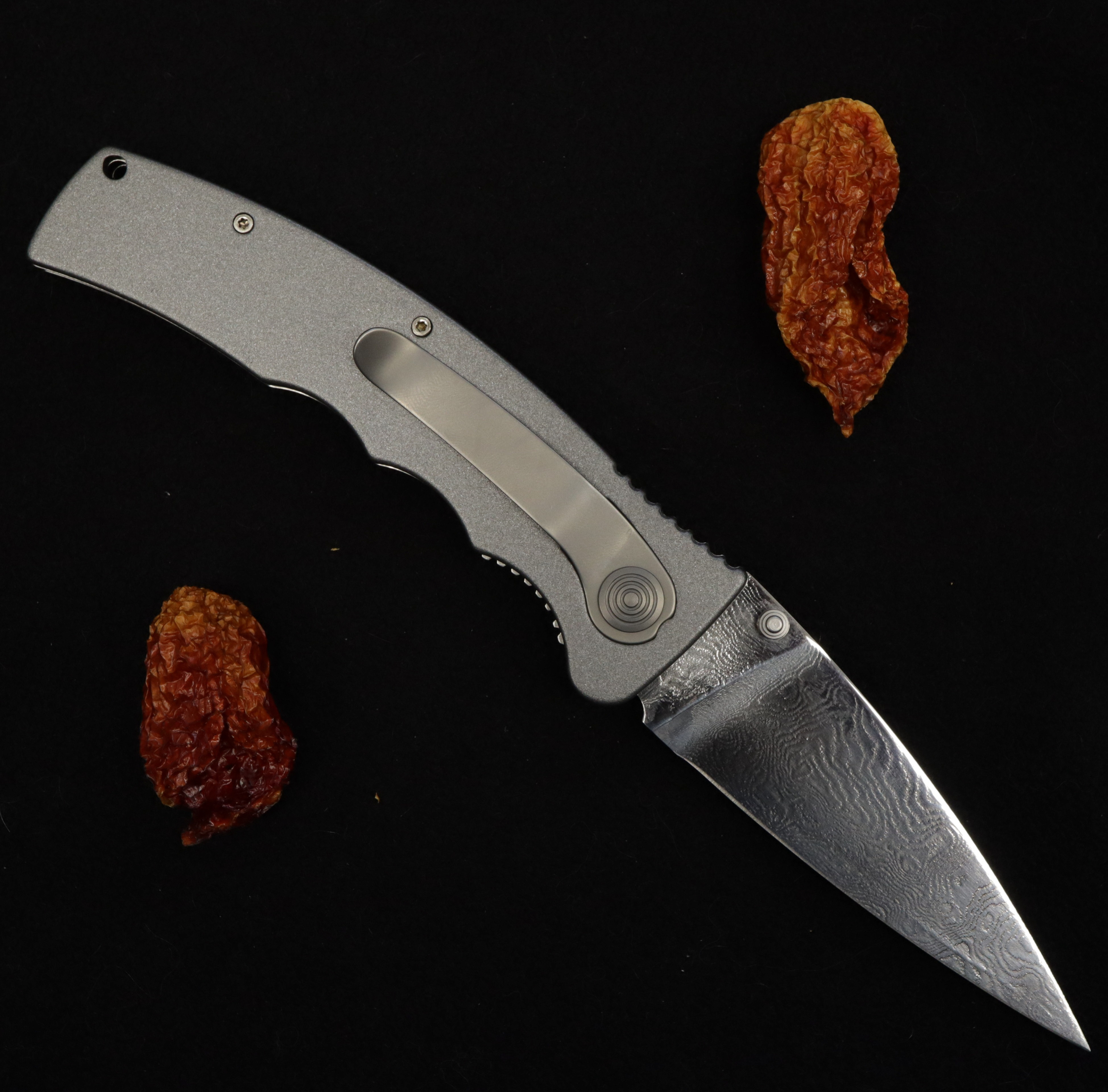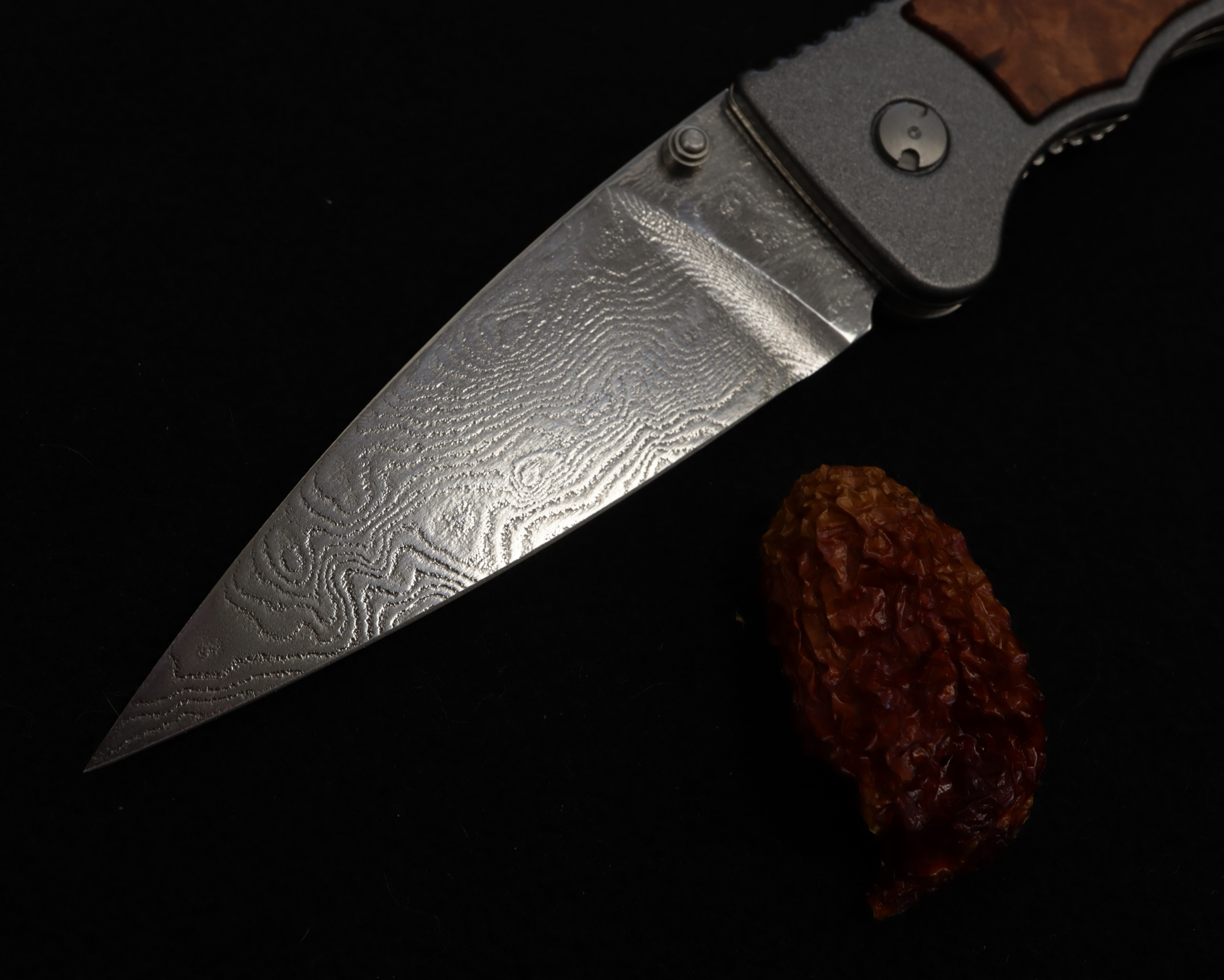 Lehký zavírací nůž s kovanou damaškovou čepelí. Ocel má 160 vrstev a vytvořil jí kovář Markus Balbach.