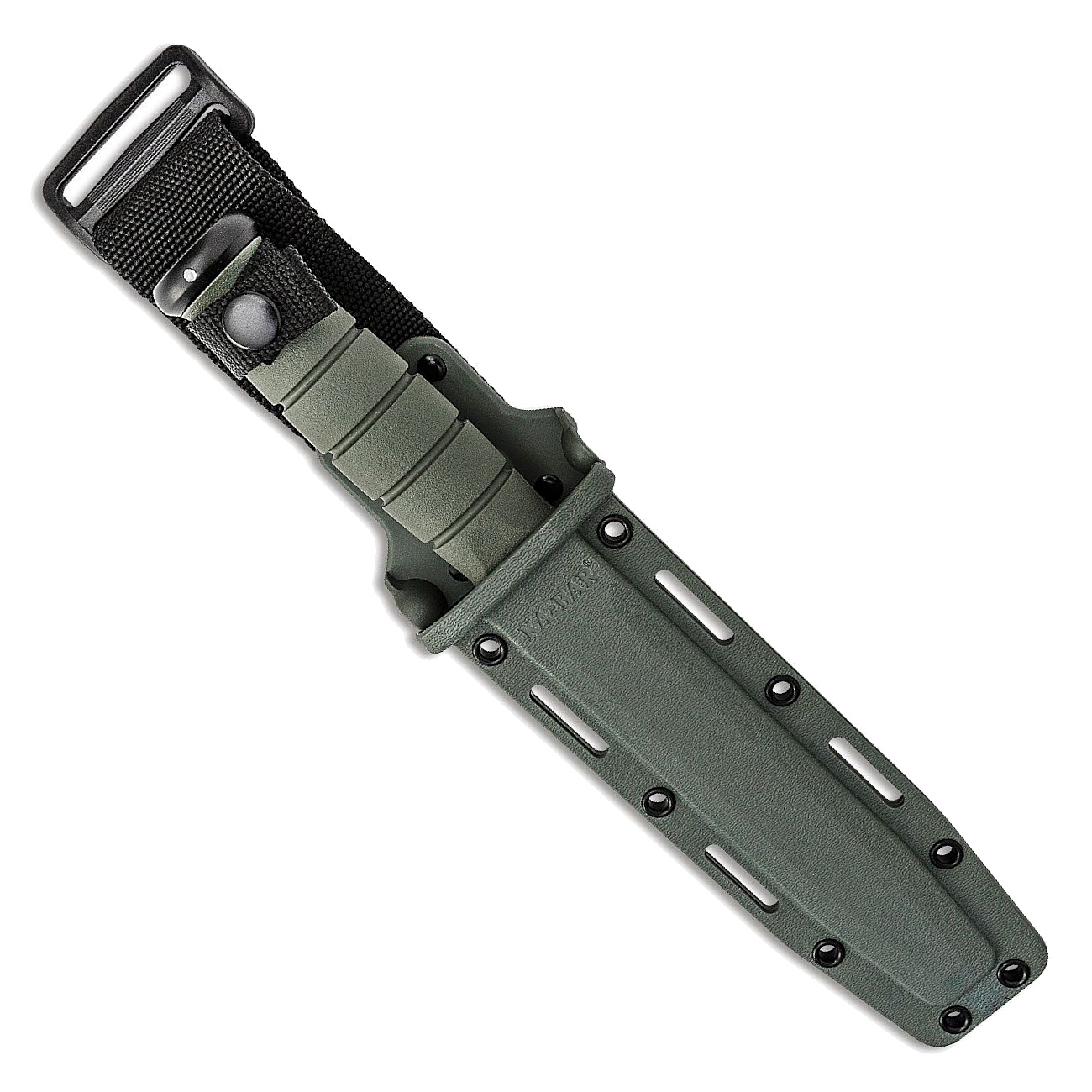 Moderní bojový nůž s odolnou čepelí z uhlíkové ocele, protiskluzovou kratonovou rukojetí a modulárním polymerovým pouzdrem.