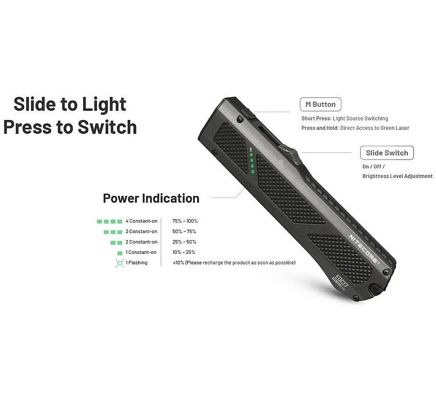 Tato svítilna je určena pro nošení v kapse, jako zavírací nůž. Má k tomu určený klip a intuitivní zapínání šoupátkovým spínačem.