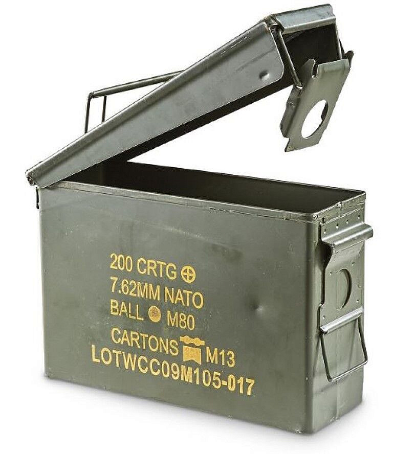 Původně vojenské muniční schránky. Jedná se o armádní výprodej použitých ocelových schránek NATO M19A1. Schránky pochází od kulometných pásů v ráži 7,62x51.