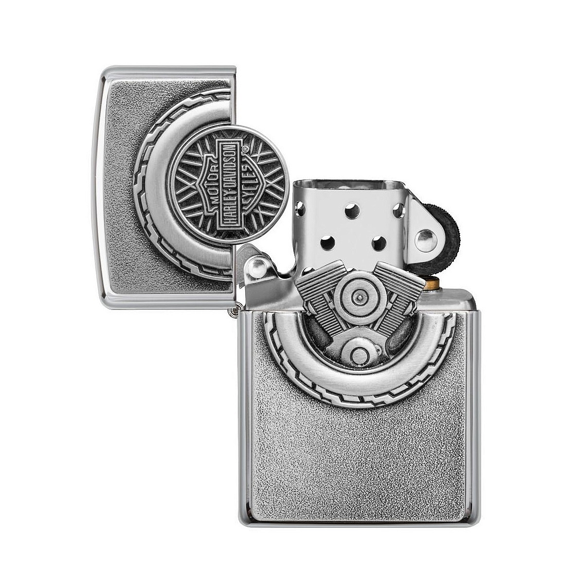 Zippo Harley-Davidson 3D Wheel Emblem with Engine je osobitý zapalovač pro příznivce značky motorek Harley. 3D provedení emblému kola se po otevření změní v ikonickou siluetu motoru H-D.