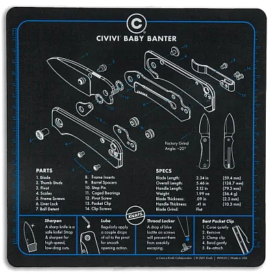 Krásná podložka pod myš s metrickým i palcovým pravítkem a specifikacemi s popisem rozborky a údržby nože Civivi Baby Banter.