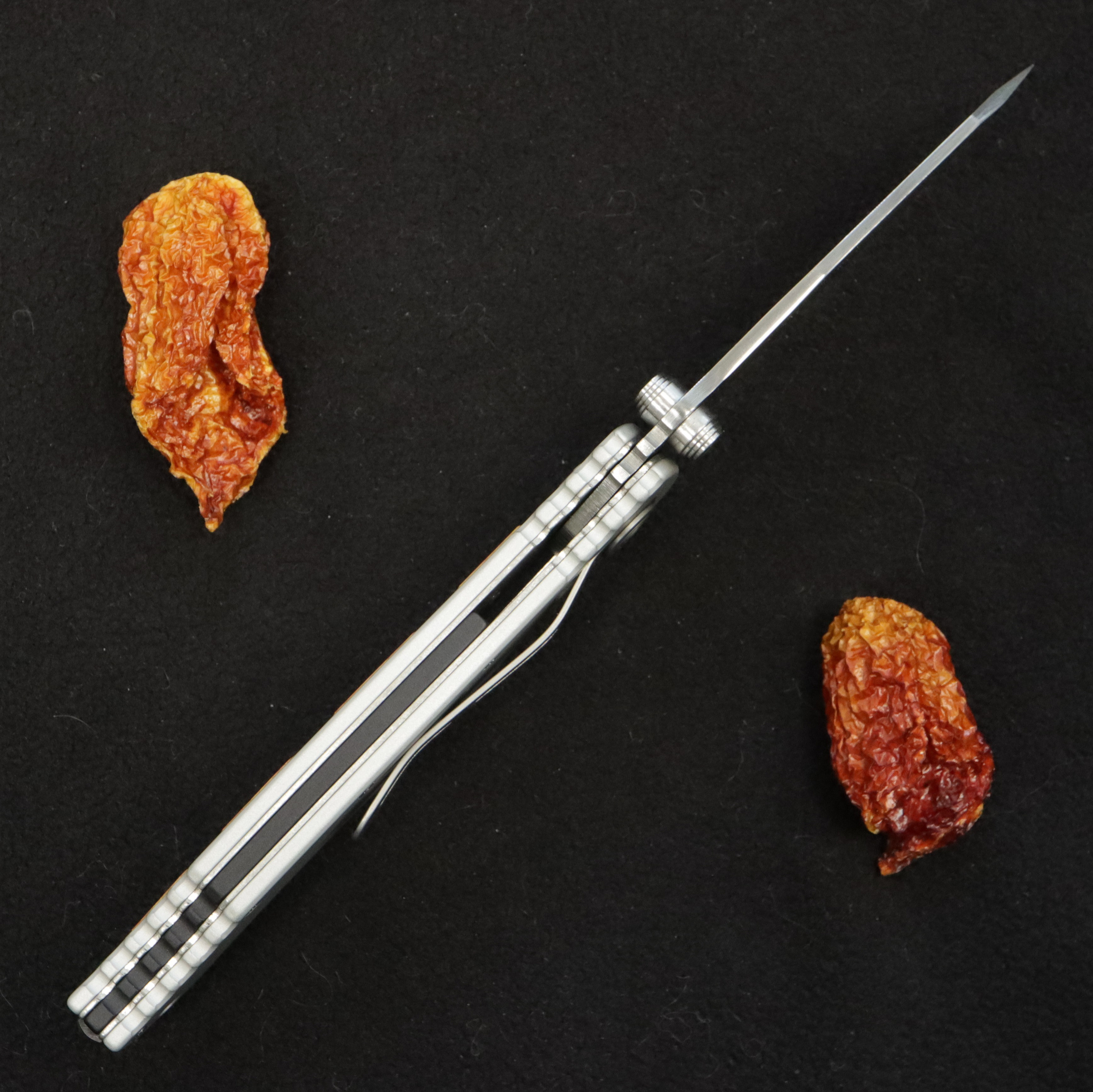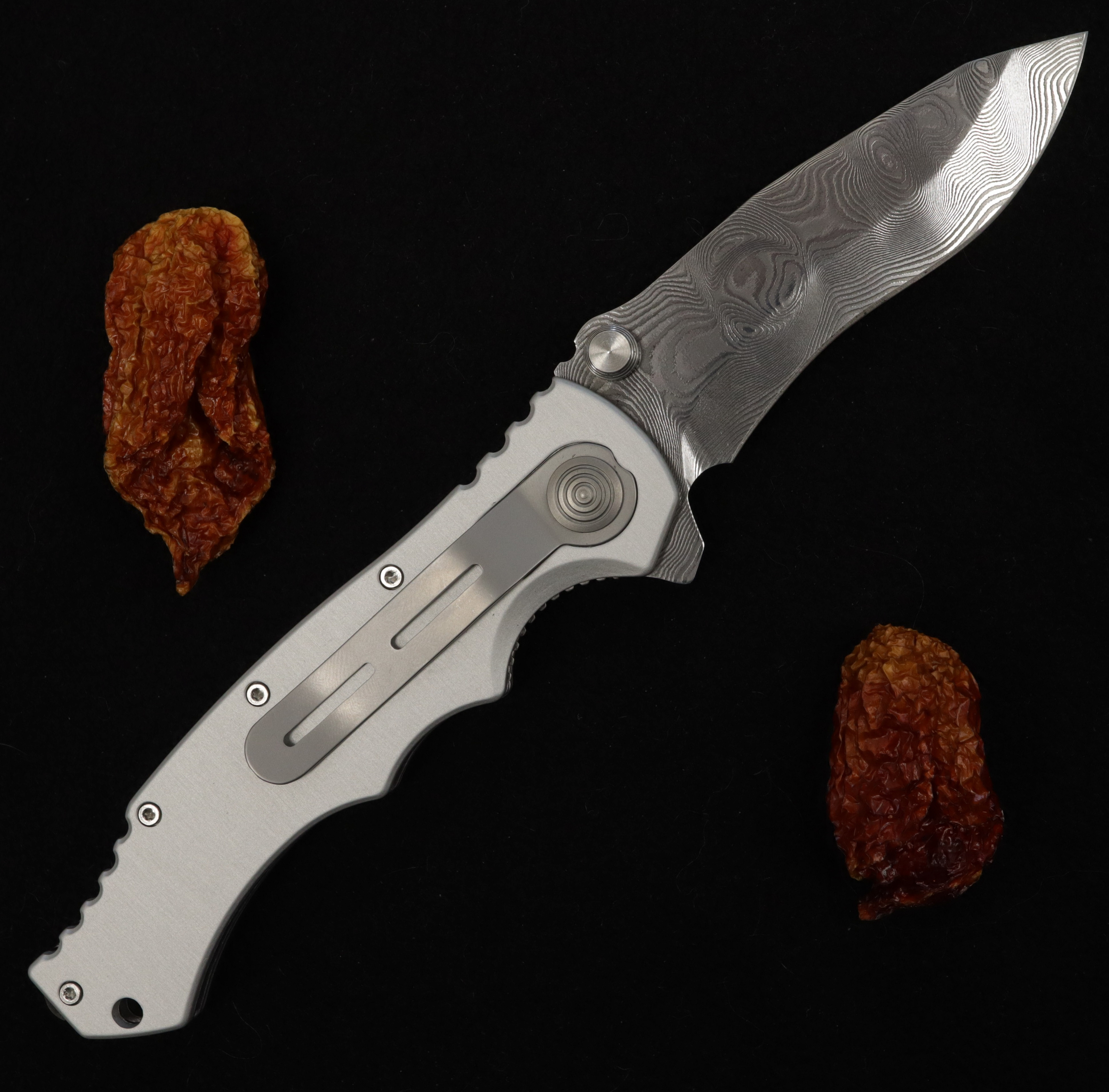 Lehký zavírací nůž s kovanou damaškovou čepelí. Ocel má 160 vrstev a vytvořil jí kovář Markus Balbach.