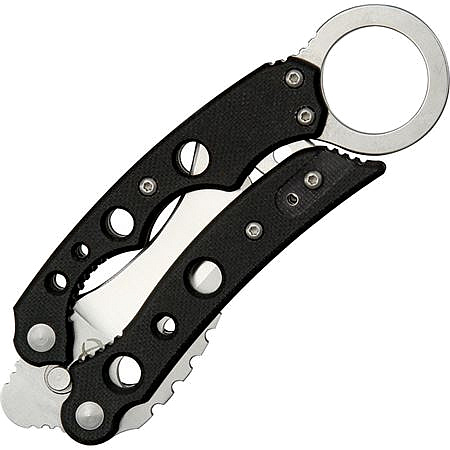 Neobvyklá, ale skvěle funkční konstrukce nože, která spojuje klasický sebeobranný a bojový karambit s oblíbeným, ale dnes již trošku přehlíženým balisongem. Nůž má výbornou čepel a ramena z oceli se střenkami z polymeru G10, který snese i hrubší zacházení. V celku je nůž velmi odolný a konstrukce funguje skvěle a bez jakýchkoliv vůlí.