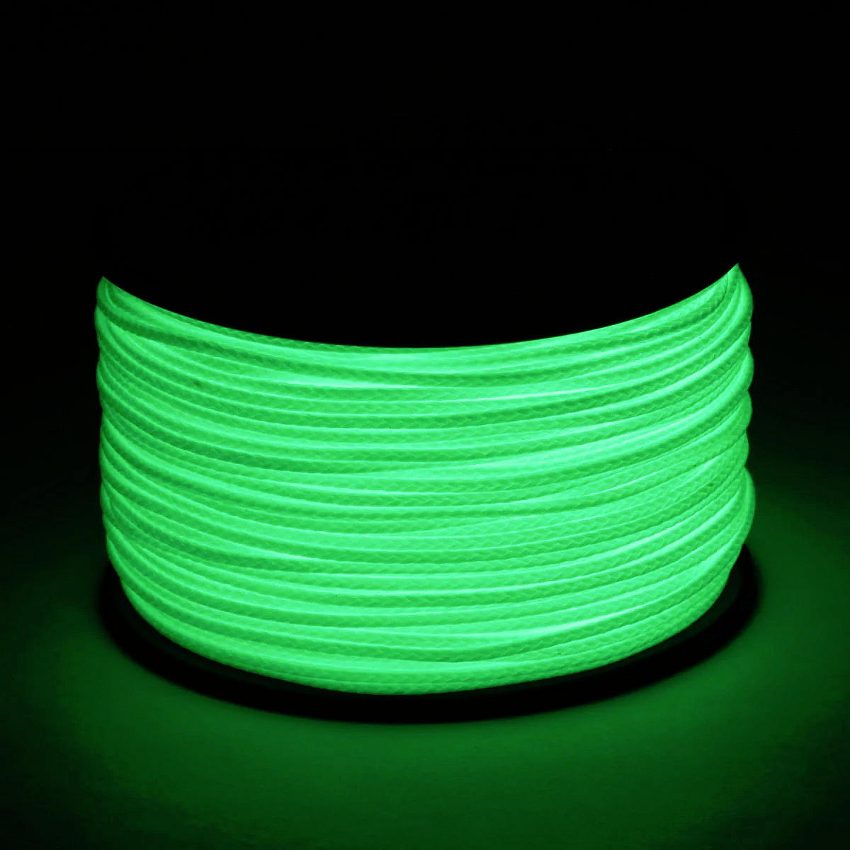 Cívka obsahující 38 metrů bílého microcordu. který po nasvícení ve tmě světélkuje.