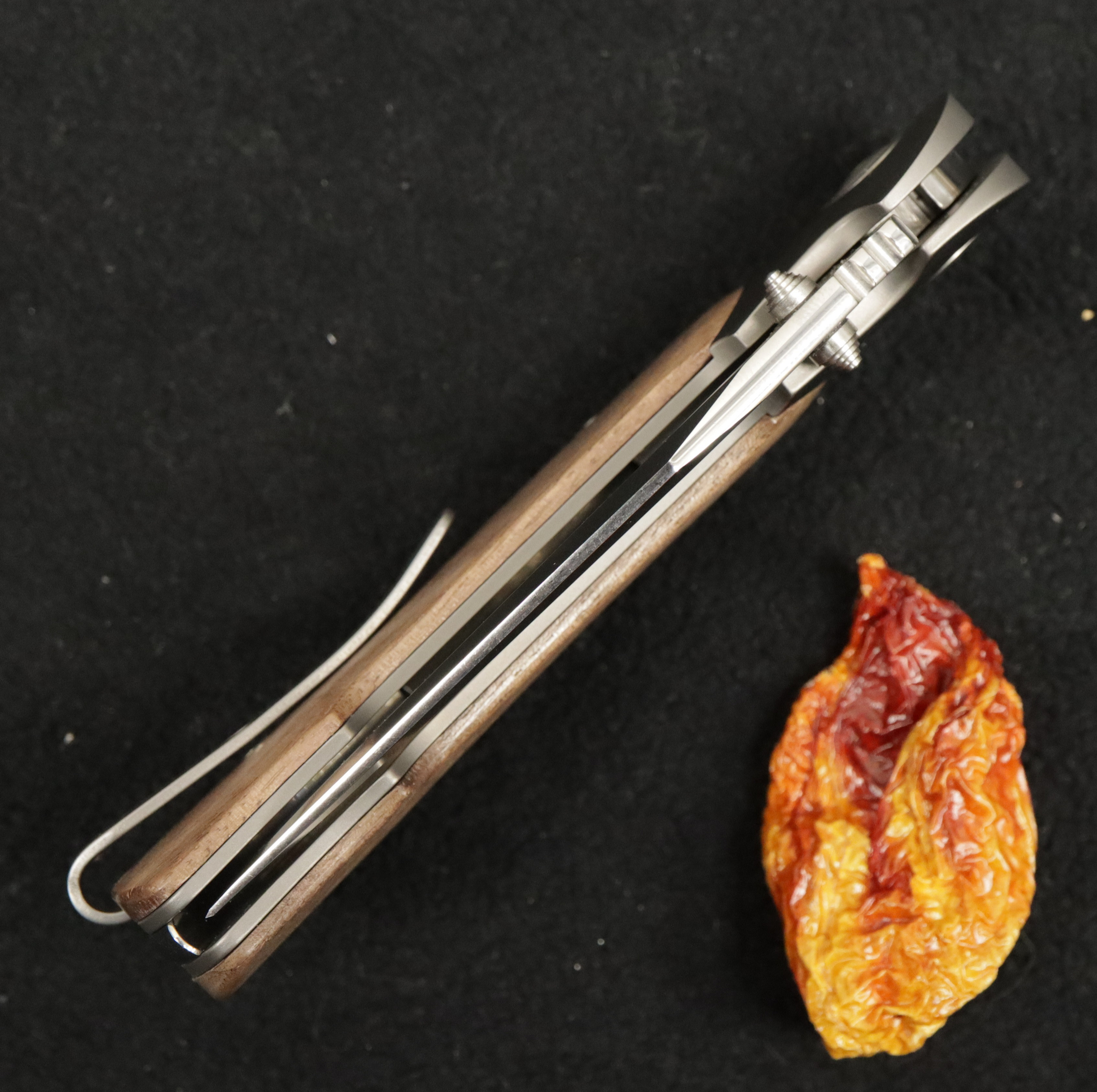 Netradiční zavírací nůž s velmi nadstandartní kvalitou zpracování. Neobvyklým designovým řešením je frézování příložek a bolsteru z jediného kusu titanu, čímž výrobce docílil hladké a elegantní linie bez nežádoucích spár. Tuto nádhernou řemeslnou práci doplňují střenky z ořechového dřeva.