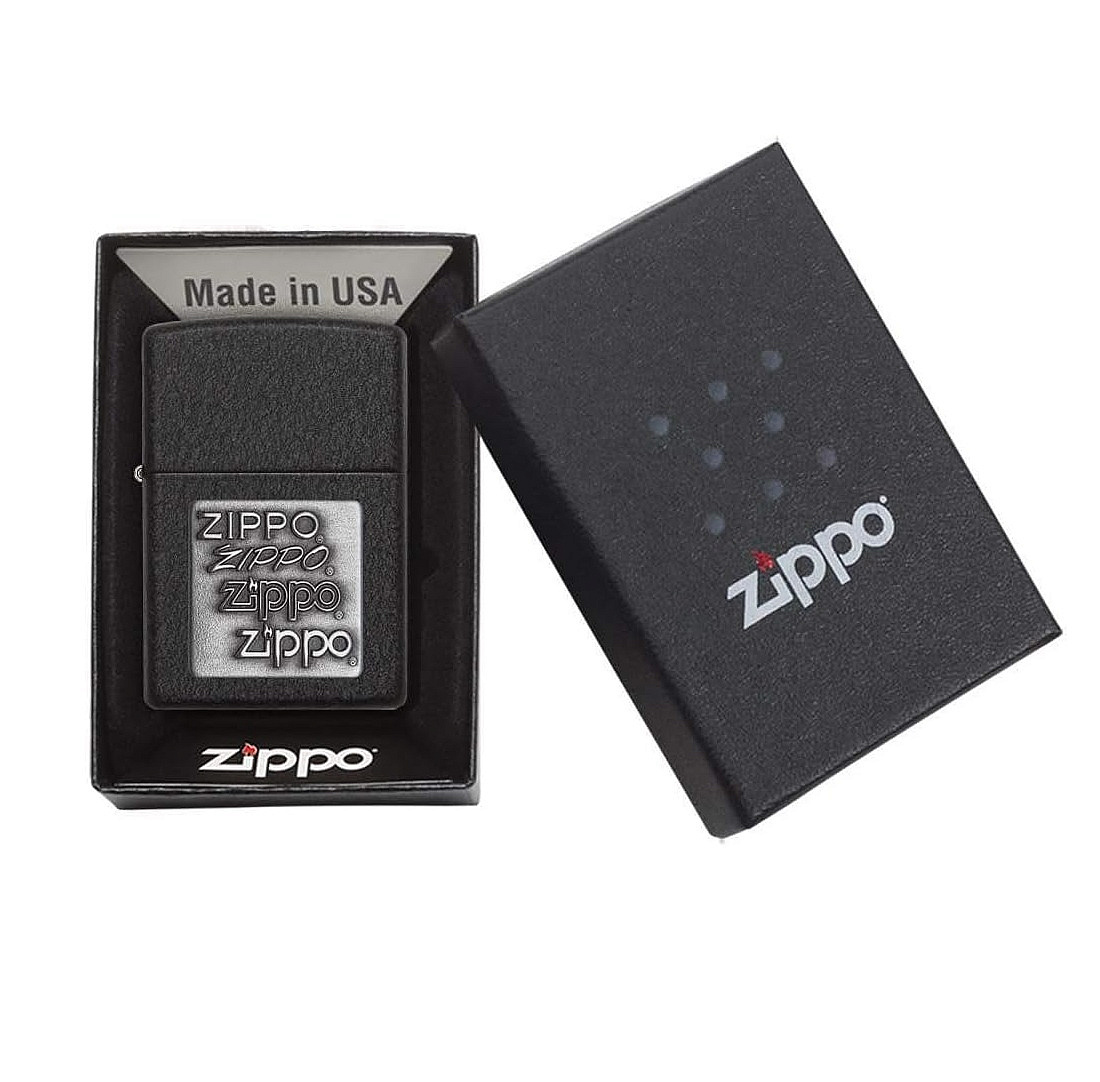 Sběratelský zapalovač s ocelovým pláštěm na němž je plastická plaketa s logem výrobce.